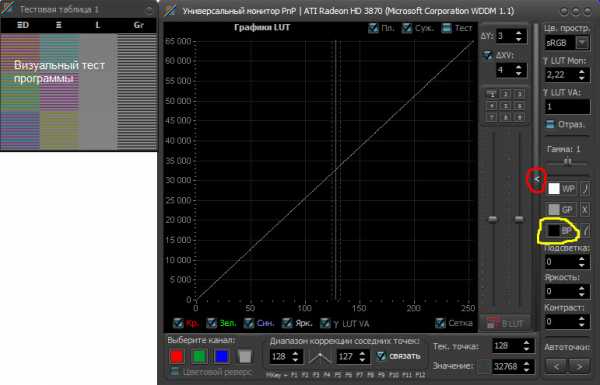 4. Затем нажимаем на кнопку визуальная коррекция LUT (находится в левом нижнем углу) — откроется новое окно программы с основными настройками + маленькое окошко с визуальным тестом.