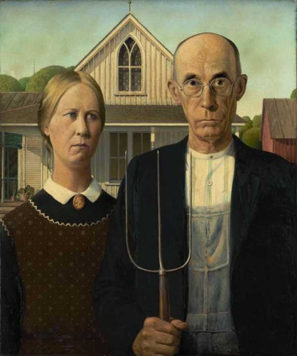 Картина с мрачными отцом и дочерью переполнена деталями, которые указывают на суровость, пуританство и ретроградство изображенных людей. Сердитые лица, вилы прямо посередине картины, старомодная даже по меркам 1930 года одежда, выставленный локоть, швы на одежде фермера, повторяющие форму вил, а значит и угрозу, которая адресована всем, кто посягнет. Все эти детали можно разглядывать бесконечно и ежиться от неуюта.