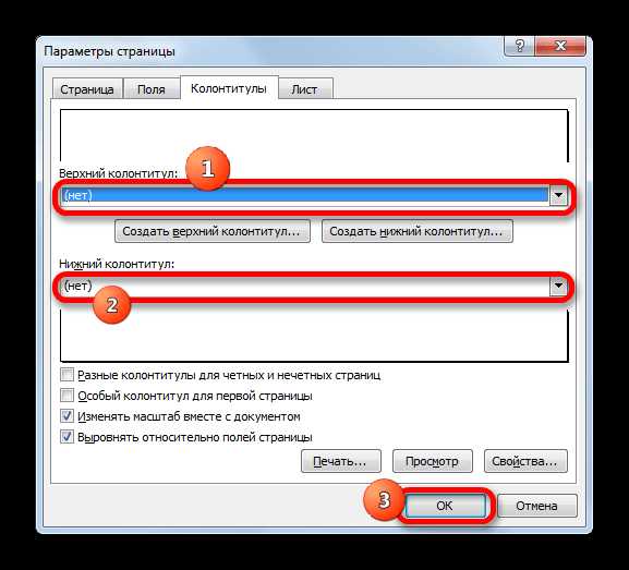 - В параметрах «Верхний колонтитул» и «Нижний колонтитул» поочередно вызываем выпадающий список. В списке выбираем пункт «(Нет)». Кликаем на кнопку «OK».