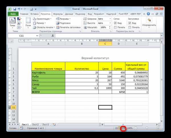 Еще один прием создания колонтитула3. В приложении Excel активируется разметка страницы.