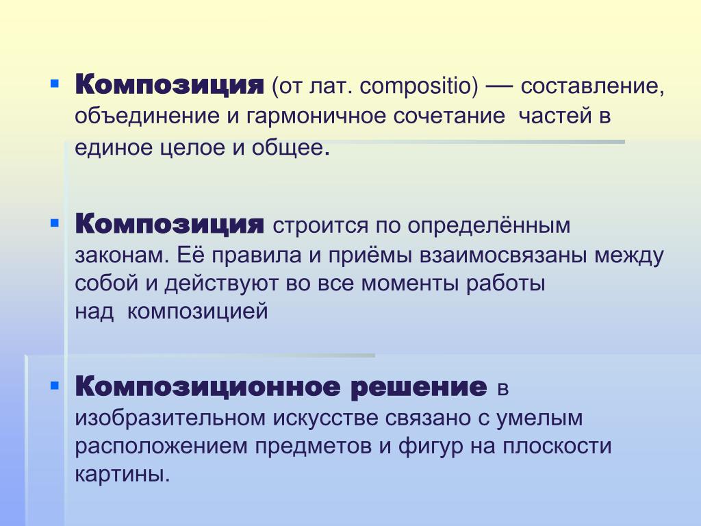 При помощи термина «композиция» можно описать и объекты нефилологического плана: театральные постановки, музыкальные действа, религиозные ритуалы, архитектурные сооружения.