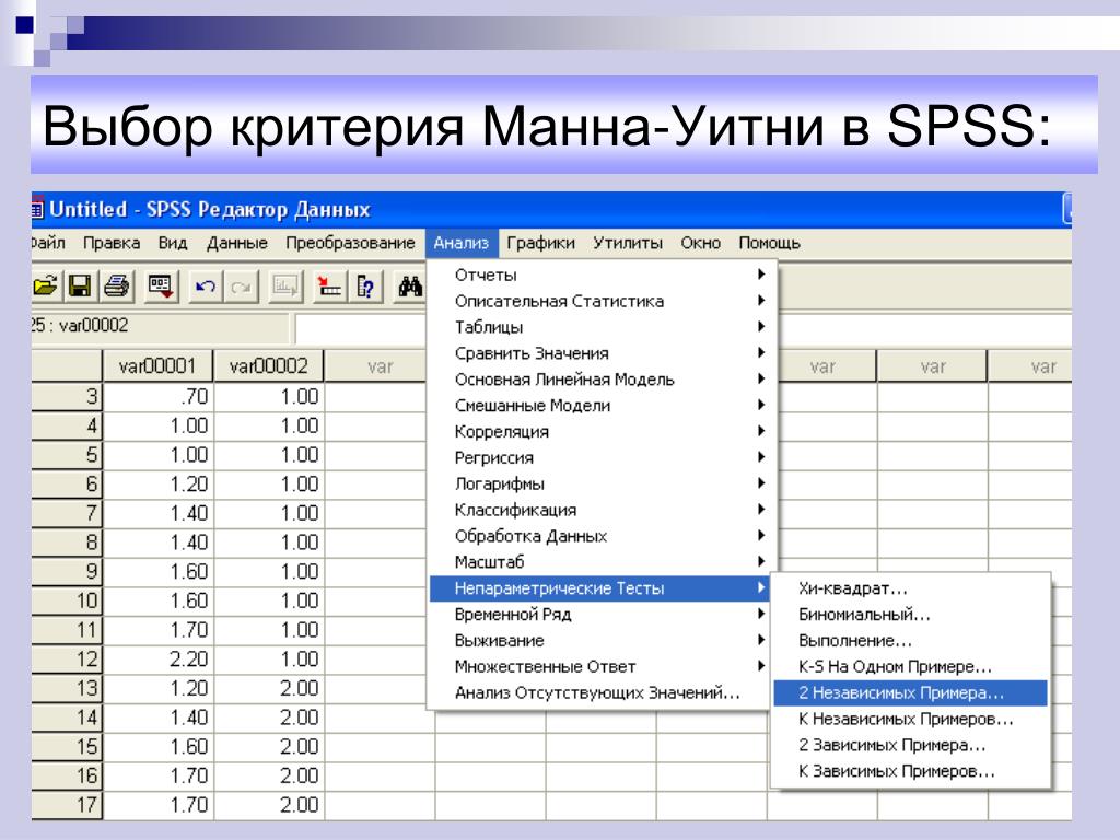 В нашем расширенном руководстве по U-тестированию Манна-Уитни мы покажем вам все шаги, необходимые для правильного ввода данных в SPSS Statistics для запуска U-теста Манна-Уитни как для Непараметрические критерии > Независимые выборки и Устаревшие диалоговые окна > 2 независимых выборки Процедуры, описанные в примечании выше.