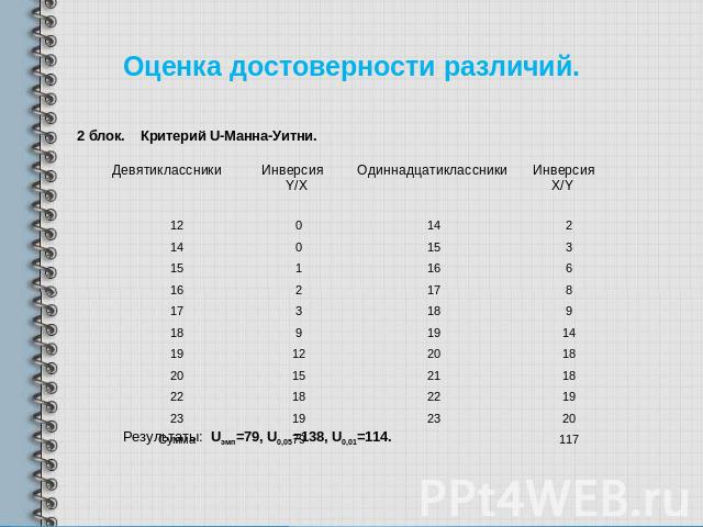 | Вариант 1 — сопоставление значений «до» и «после» отдельно по экспериментальной и контрольной группам: G — критерий знаков; Т — критерий Вилкоксона Вариант 2 — сопоставление сдвигов в двух группах: Q — критерий; U — критерий Манна-Уитни; φ* — критерий Фишера |