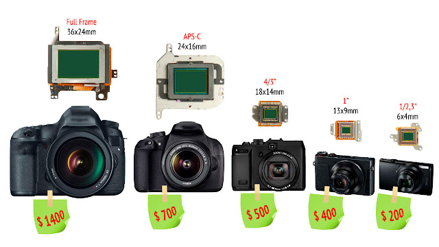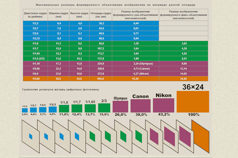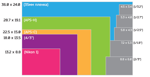 Вот иллюстрация, показывающая размеры популярных меньших форматов сенсоров изображения по сравнению с 35-мм полнокадровыми: