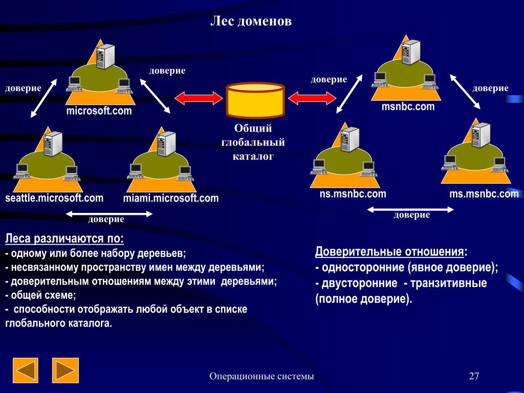 - Двустороннее доверие между лесами образует транзитивное отношение доверия между всеми доменами в обоих лесах.