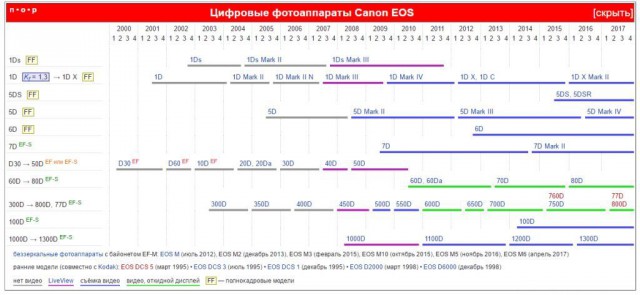 - Таблица всех цифровых зеркальных фотоаппаратов Canon EOS с датой анонса