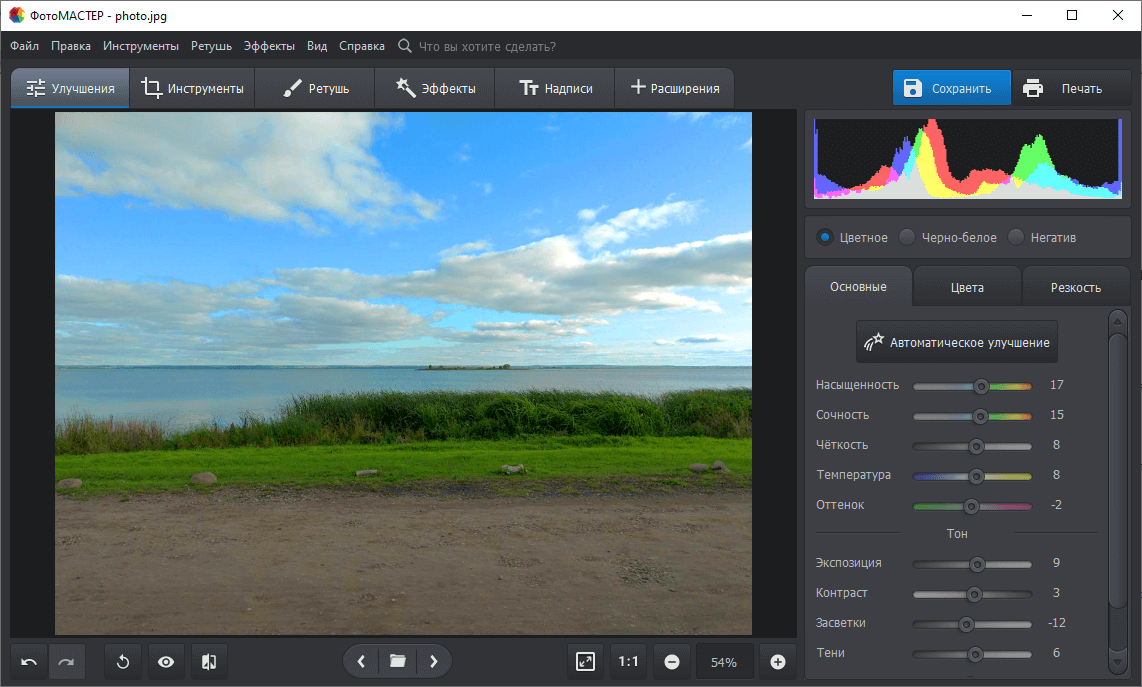 ПК-редактор предлагает пользователям множество инструментов: цветокоррекцию, копирование, улучшение, кисти, выделение. Преимущество программы в том, что в ней можно работать со всеми популярными форматами и практически на любом компьютере (даже на Linux). Также в программе есть удобный встроенный файловый менеджер.