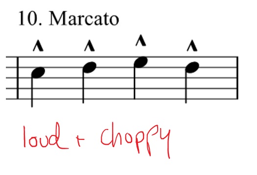 Если вы хотите сыграть ноту с большей выразительностью, акцентируйте ее очень простыми словами. Но если вы хотите, чтобы звук был мощным и сильным, играйте в стиле маркито и обрезайте его.