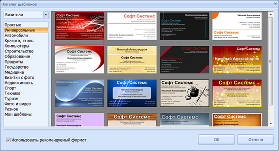 Тем, кто всё ещё сомневается, справится ли он с изготовлением различных видов карточек, рекомендуется начать со знакомства с готовыми шаблонами. «Мастер Визиток»предлагает порядка шести сотен вариантов на разные темы. Среди них:
