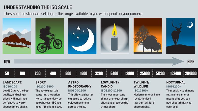 В настоящее время цифровые камеры могут мгновенно изменять чувствительность ISO, когда это необходимо, чтобы сделать камеру (эффективно) более чувствительной к свету, поэтому вы можете использовать ISO100 или ISO200 при съемке на улице в условиях яркого солнечного света или использовать более высокую чувствительность ISO, например как ISO800 или ISO1600 при съемке в помещении или в условиях низкой освещенности.