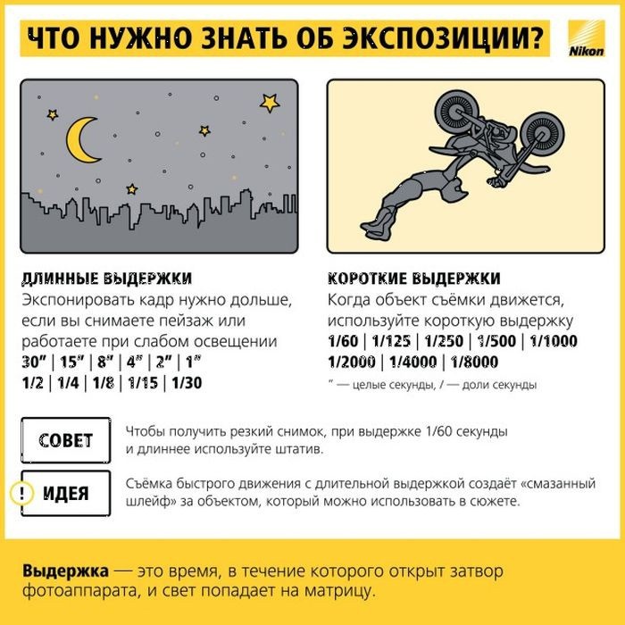 Короткая выдержка способна останавливать движение на снимке, длинная же выдержка подчёркивает движение, размывая движущиеся объекты (подробнее – в статье «Выдержка»).