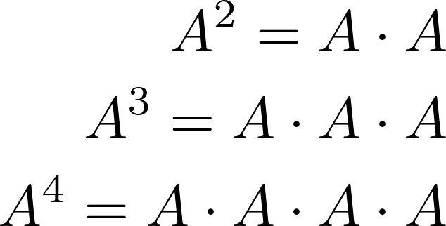 Для квадратной матрицы 𝐴 и положительного целого числа степень 𝐴 определяется многократным умножением этой матрицы на себя; то есть 𝐴 = 𝐴 × 𝐴 × ⋯ × 𝐴, где есть копий матрицы.