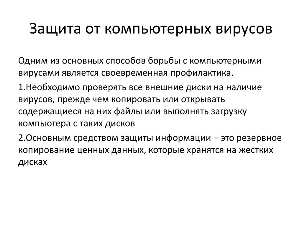 Для того, чтобы не подвергнуть компьютер заражению вирусами и обеспечить надежное хранение информации на дисках, необходимо соблюдать следующие правила: