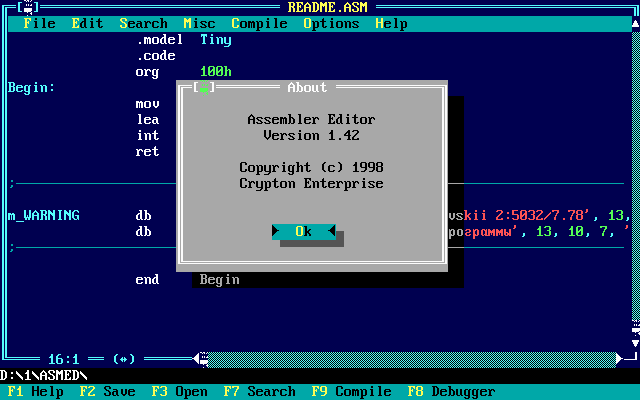 Когда я добрался домой и сел за свой компьютер, я понял, пошёл вспоминать молодость. Как скомпилировать ассемблер? В своё время, когда мы всему этому учились, у нас был TASM, MASM и MASM32. Я лично пользовался последними двумя. В каждом ассемблере был линкер и сам компилятор. Из этих трёх проектов в живых остался только оригинальный MASM.