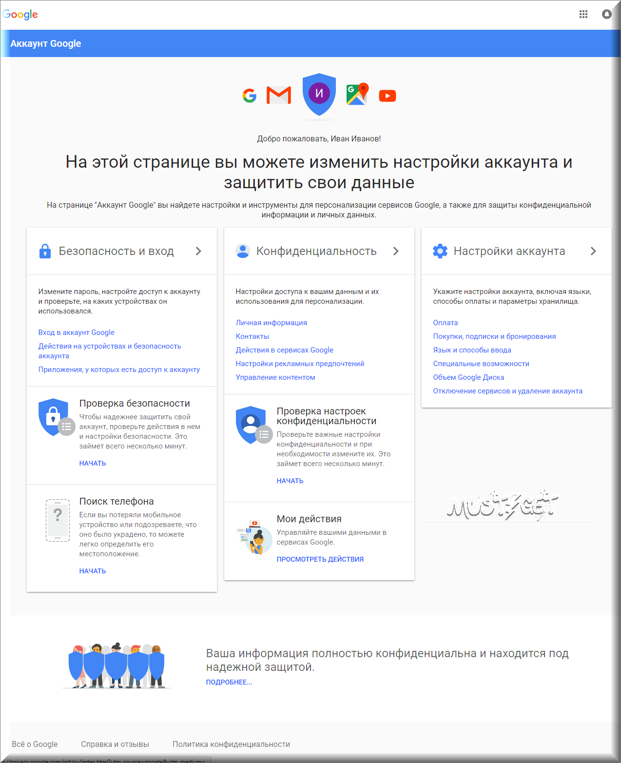 Вы войдете в систему и перейдете на страницу Google-аккаунта, в который вы только что вошли.
