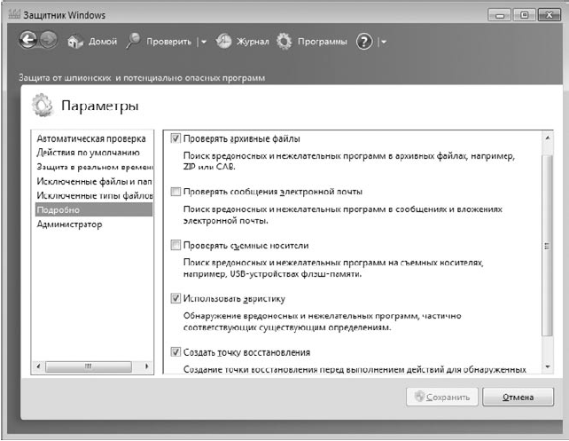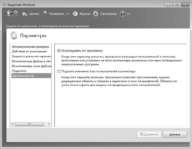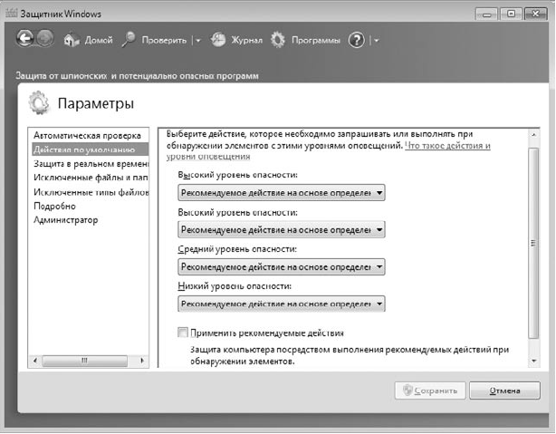 14.3. Настройка параметров Программа Защитник Windows имеет достаточно много параметров, с помощью которых можно настраивать, в частности, ее реакцию на те или иные события. Например, с помощью параметров можно задать плановое сканирование компьютера.Чтобы получить доступ к