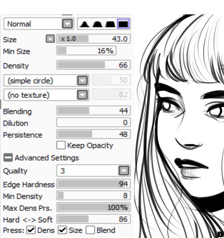 К слову, Spacing — расстояние между мазками, и с изменением этого параметра меняется плотность штриха.
