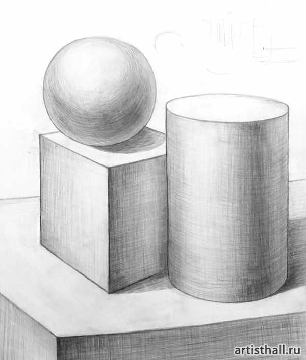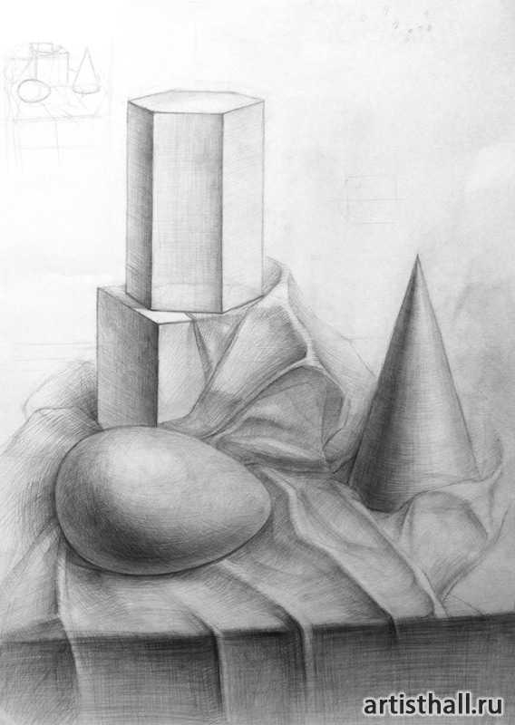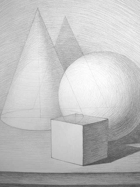 Работа над натюрмортами из геометрических тел закладывает навыки построения композиции, пропорционального размещения предметов на листе, техники моделирования штрихом различных форм, построения теней, передачи пространства и удаления фигур, которые впоследствии пригодятся в следующих заданиях программы, живописных натюрмортах и других видах творческих занятий.