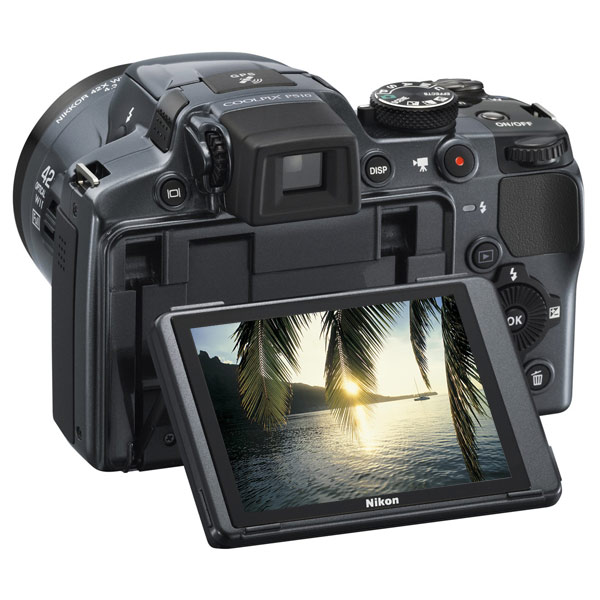 Как упоминалось ранее, Nikon P510 оснащен 3-дюймовым наклоняемым ЖК-экраном. Экран отодвигается вокруг горизонтального поворота, а затем может быть наклонен примерно на 180 градусов по горизонтали. Хотя это эффективная реализация наклонного экрана, это не обязательно самый эффектный вариант — гораздо предпочтительнее конструкция, в которой экран поворачивается на шарнире слева от корпуса камеры, что позволяет поворачивать его на 360 градусов.