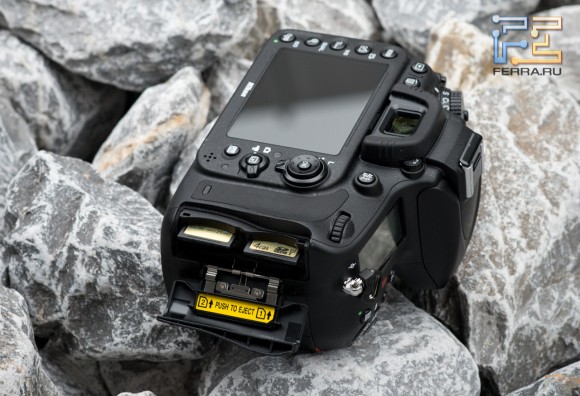 Аппарат оснащен двумя слотами для карт памяти форматов SD/SDHC/SDXC, которые могут использоваться одновременно, по очереди или для хранения файлов разного типа (например, JPEG и RAW). Карты формата CompactFlash не поддерживаются.