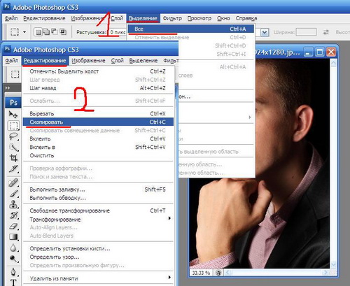 Отличие его заключается в том, что перед копирование надо выделить документ с помощью Ctrl+A. Кроме того, выбрать всё изображение можно, если кликнуть по вкладке главного меню Выделение —> Всё (Select —> All). При выделении всего изображения, по периметру всего изображения появятся «марширующие муравьи».