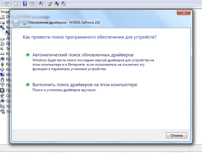 Теперь, с помощью контекстного меню, вызываемого правой кнопкой мыши, нажимаем на «Обновить драйвер». Либо дважды щелкаем по драйверу и в открывшемся окошке жмем на «Драйвера» и следом на «Обновить». И теперь, в новом окне перед нами возникает выбор из двух вариантов обновления. Если у вас нет готовых драйверов на компьютере, то нажимаем на «Автоматический поиск обновленных драйверов».