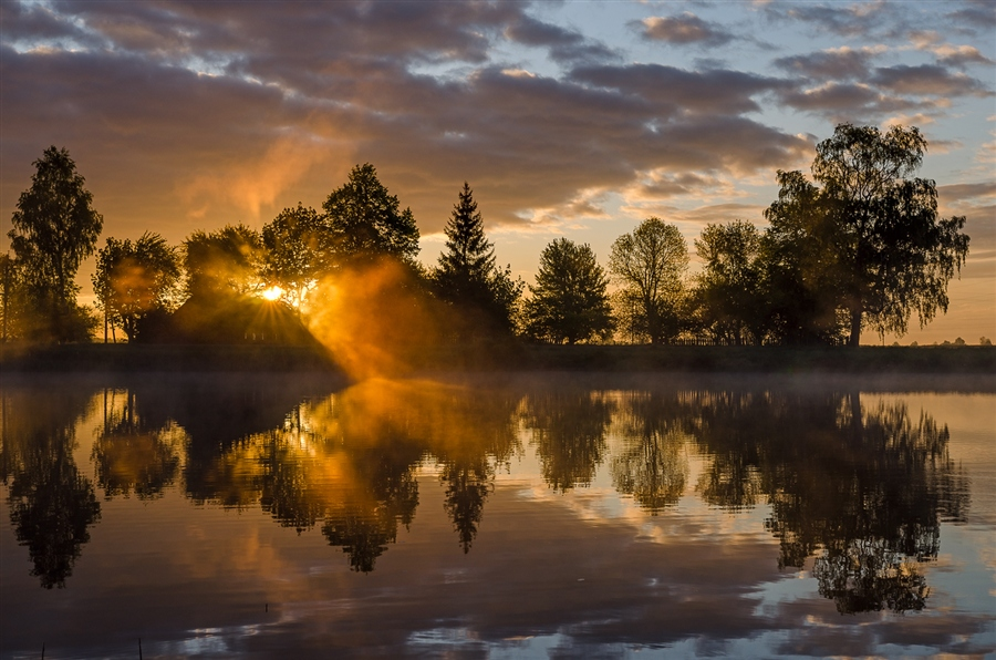 Подпись к фото: Работа с одним кадром. В Adobe CameraRaw сделана заливка неба оранжевым градиентом и улучшен цвет. Солнечные лучи выполнены в Photoshop. Небольшие изменения цвета и выдержки — с помощью Nik Color Efex Pro.