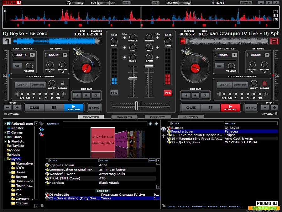 Virtual DJ – удобная бесплатная прога. 2 деки/4 деки, цифровые эффекты, сэмплер – для новичка недостатков в функционале нет.