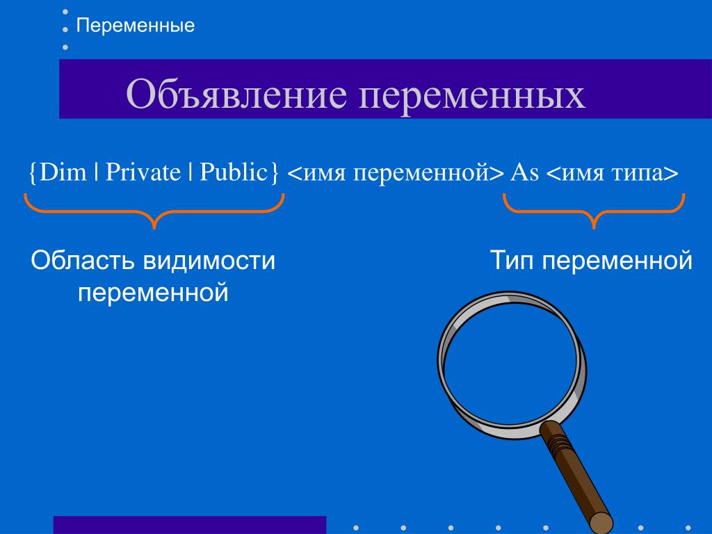 сначала идет оператор области действия (Dim, Public,Static), сразу за ним имя переменной, затем оператор As и тип.