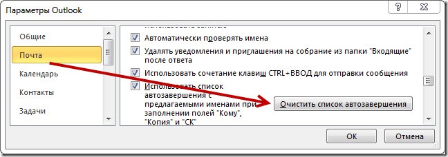 В разделе Отправка сообщений очистите Использовать список автозаполнения, чтобы предлагать имена при вводе в строки «Кому», «Копия» и «СК»