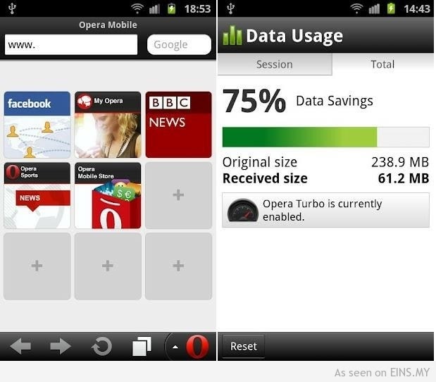 Чтобы сэкономить данные на цифры, сжатие данных Opera Mini сокращает данные страниц до 10% от их истинного размера, что составляет значительную долю 50% -ного сокращения Opera Mobile.