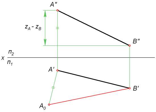 Для того чтобы найти натуральную величину отрезка AB (рисунок выше), строим прямоугольный треугольник A0A’B’. Его первый катет A’B’ – это горизонтальная проекция AB. Второй катет A’A