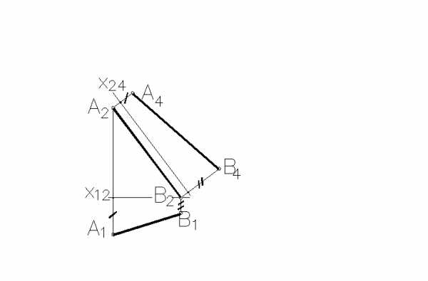 Перпендикулярно фронтальной проекции фронтали провести первую новую ось чертежа х24и построить новые проекции вершин треугольника A4,B4,C4 наП4