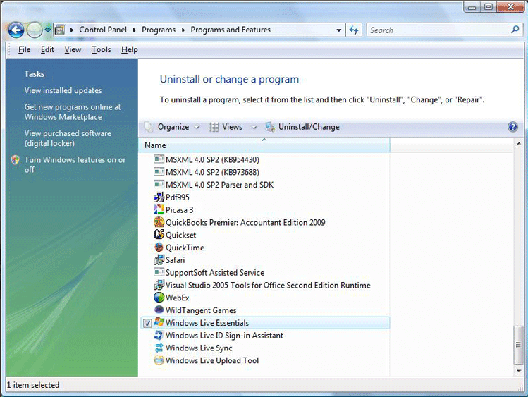 - Нажмите на нужную программу (в нашем случае «Основные компоненты Windows Live»).