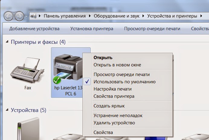 - Сделайте щелчок правой кнопкой мыши по значку принтера и в открывшемся меню выберите ваш принтер по его названию.