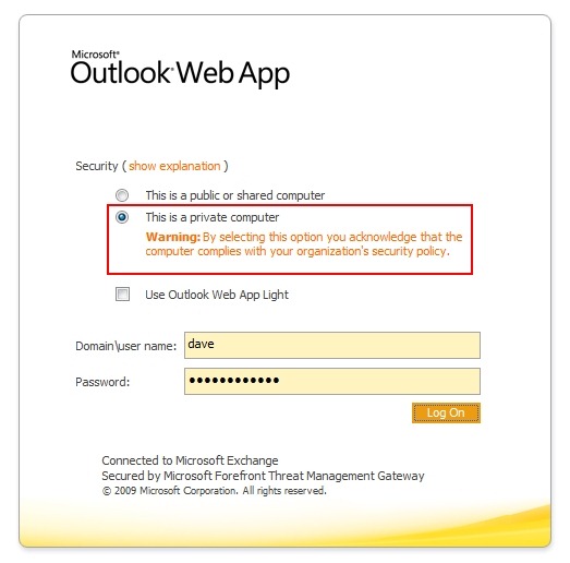 Если вы не знаете имя пользователя и пароль Outlook Web App, вам следует связаться с администратором сети.