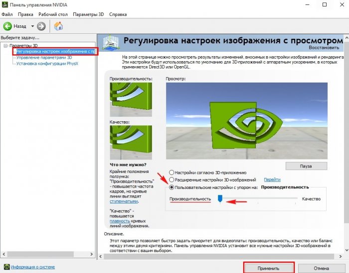 Настройки изображения с предварительным просмотром- Здесь щелкните первую вкладку, и справа вы увидите вращающийся значок Nvidia.