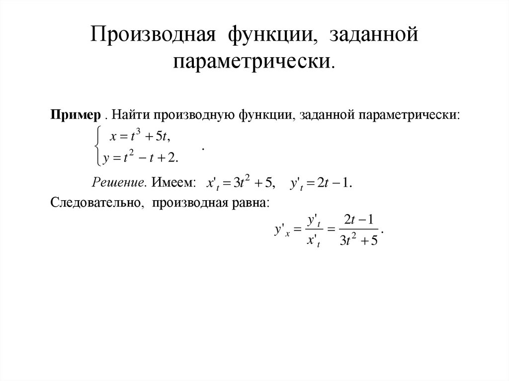 Полученная формула позволяет находить производную у’х от функции заданной параметрически, не находя непосредственной зависимости у от х.