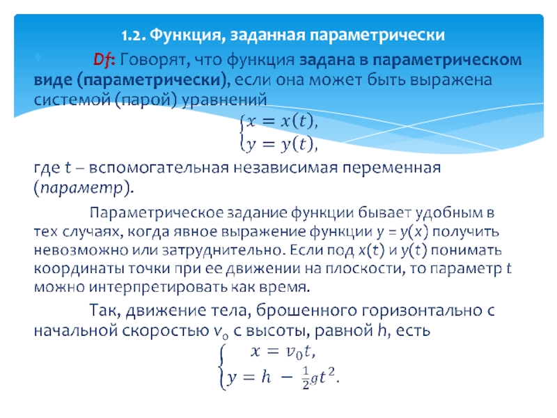 Параметрическое уравнение — это уравнение, в котором координаты кривой $x$ и $y$ записываются как функции другой переменной, называемой параметром; обычно это обозначается буквой $t$ или $\theta$. 92$.