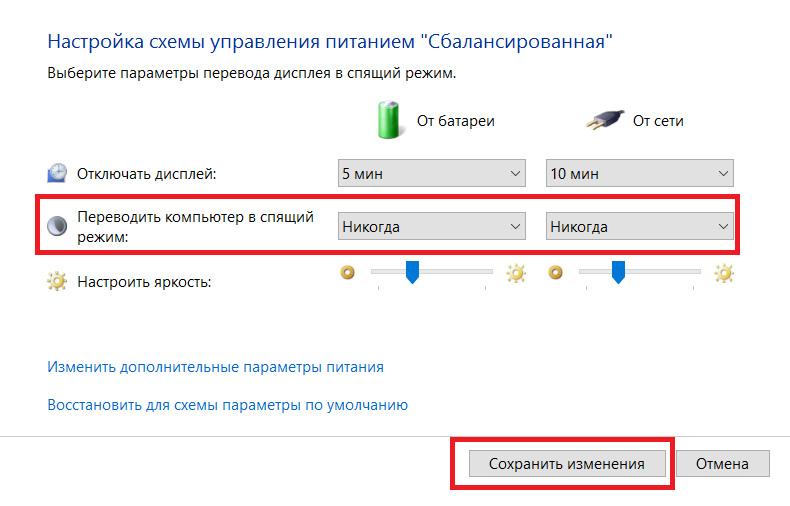Обратите внимание: если у вас ноутбук, то время перехода в режим сна и отключения дисплея нужно выставлять для питания от батареи и от сети.