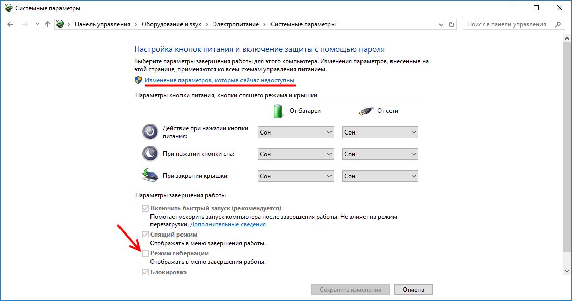 - Выберите Действие кнопки питания , а затем выберите Изменение параметров, которые сейчас недоступны .В разделе Параметры завершения работы Установите флажок Гибернация , затем нажмите Сохранить изменения .