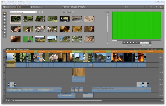 Первым шагом в создании мульти-камерного проекта является импорт клипов в окно редактора. В большинстве случаев это будет выбор клипов из того же арсенала, который был импортирован в Корзину проекта Pinnacle Studio 19.