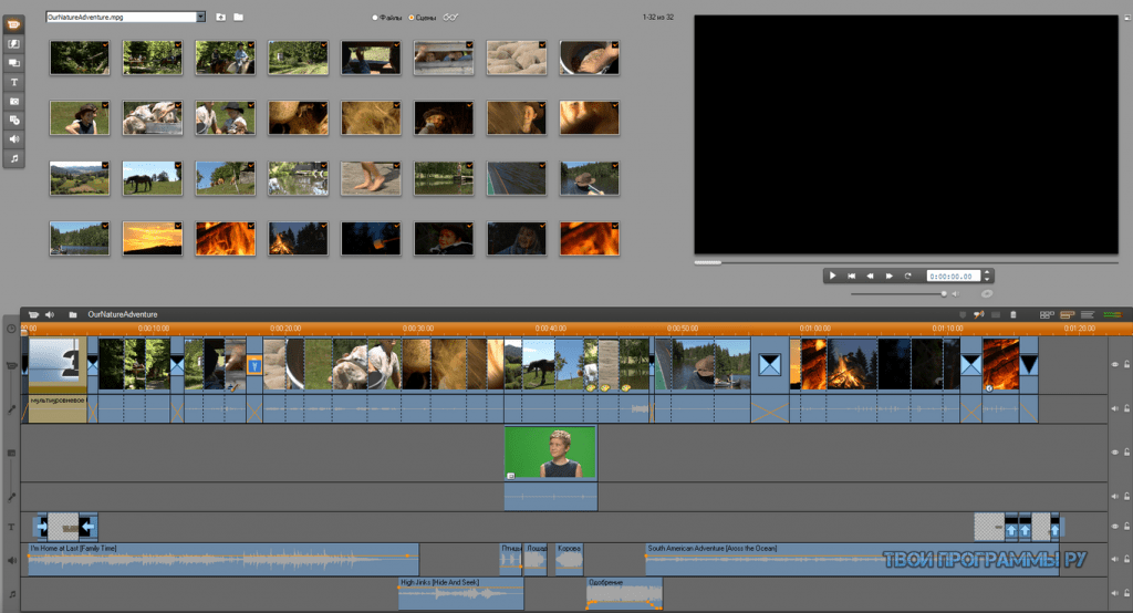 При очень большом нежелании вы можете и вовсе ничего не делать, а всю работу перепоручить встроенной функции «Smart Movie». При ее использовании вам нужно только перенести желаемые клипы на специальную панельку, расположенную в нижнюю часть экрана, выбрать музыку и стиль фильма — аналог временной шкалы Adobe Premiere. Все! Результатом, конечно, будет не «Матрица», но вполне приличный видеоклип снабженный к тому же музыкальным сопровождением из набора программы.
