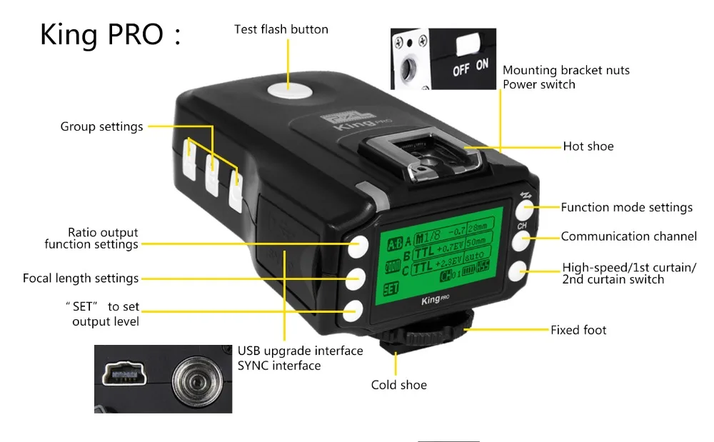 При подключении к совместимой вспышке Pixel King предлагает следующие основные функции: