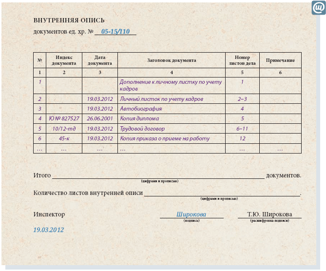 Внутренняя опись составляется в дела, содержащие особо ценную и личную документацию, а также в случаях, если заголовки дел не раскрывают конкретное содержание документов, например: «Приказы директора по основной деятельности».