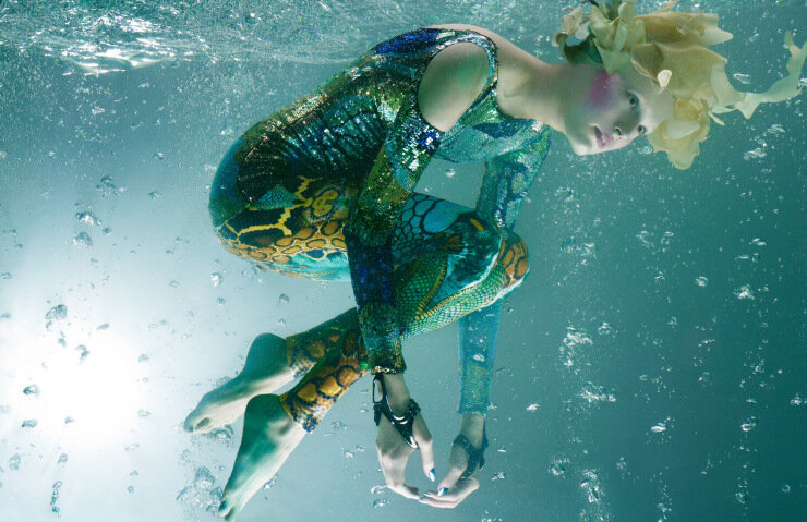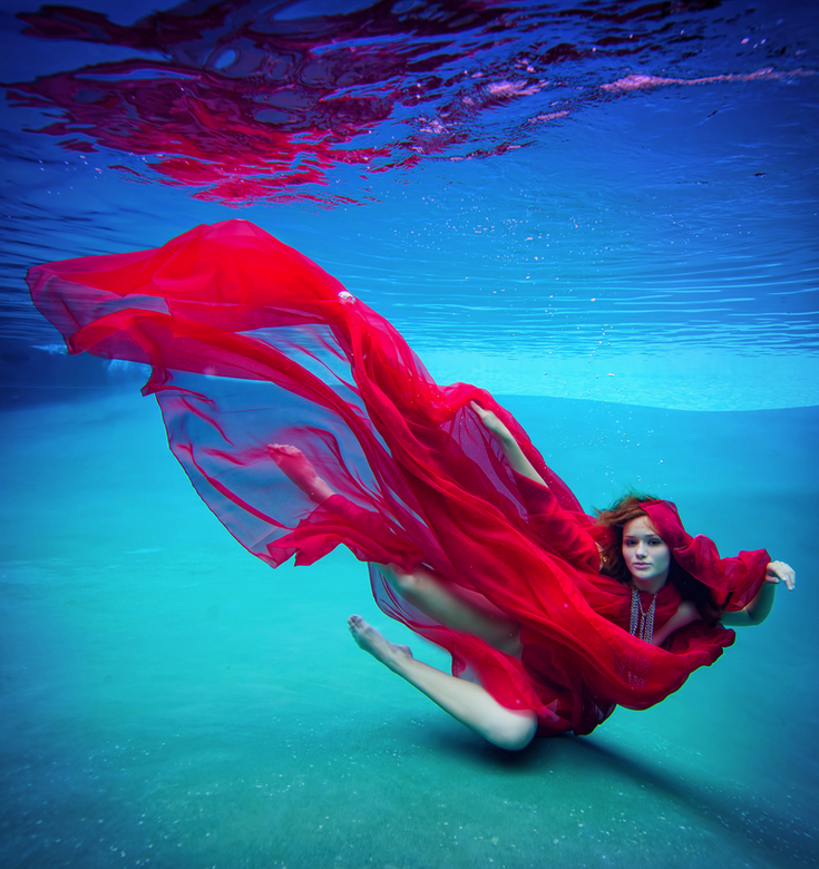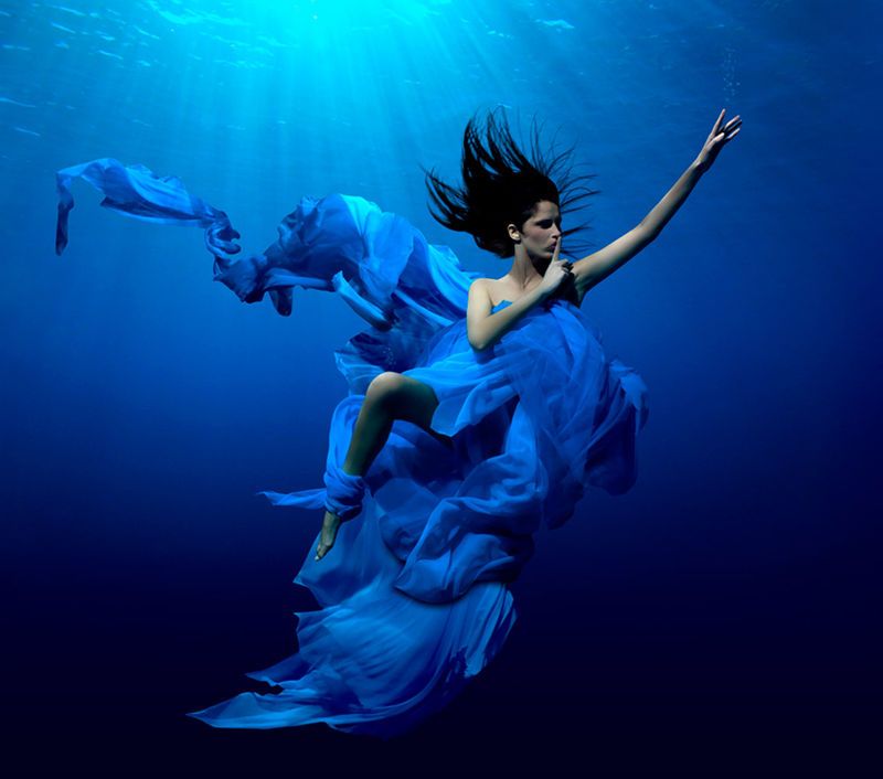 Вода тянет ткань и развевает волосы модели, что позволяет создавать потрясающие подводные фотографии.