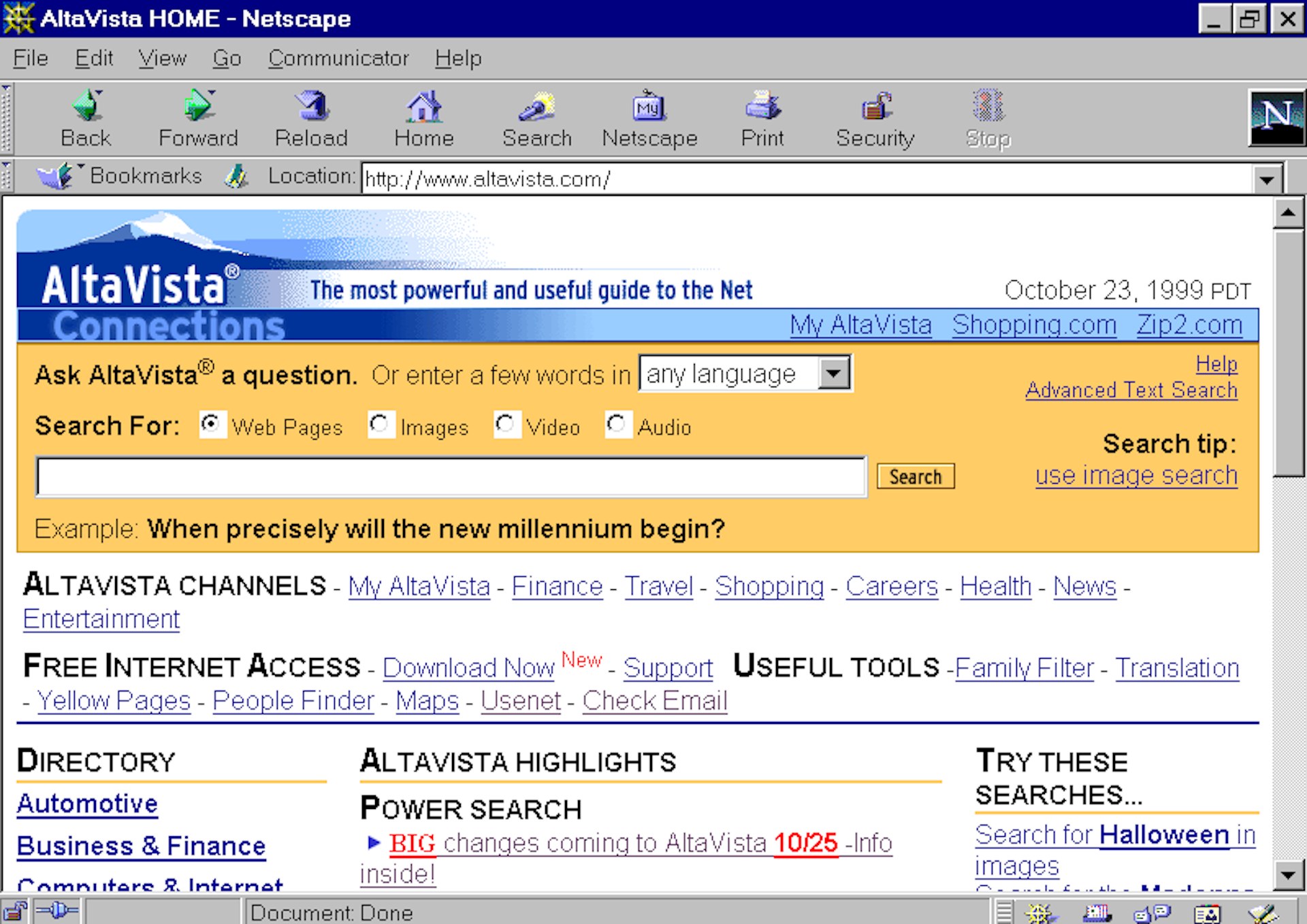По адресу www.altavista.digital.com обычные пользователи могли выполнять поиск в вебе с такой степенью глубины и сложности, которая была недоступна большинству поисковых движков того времени. Система оказалась революционной: наконец кто-то создал поисковый движок Интернета, обращавшийся с Интернетом со всем должным уважением.