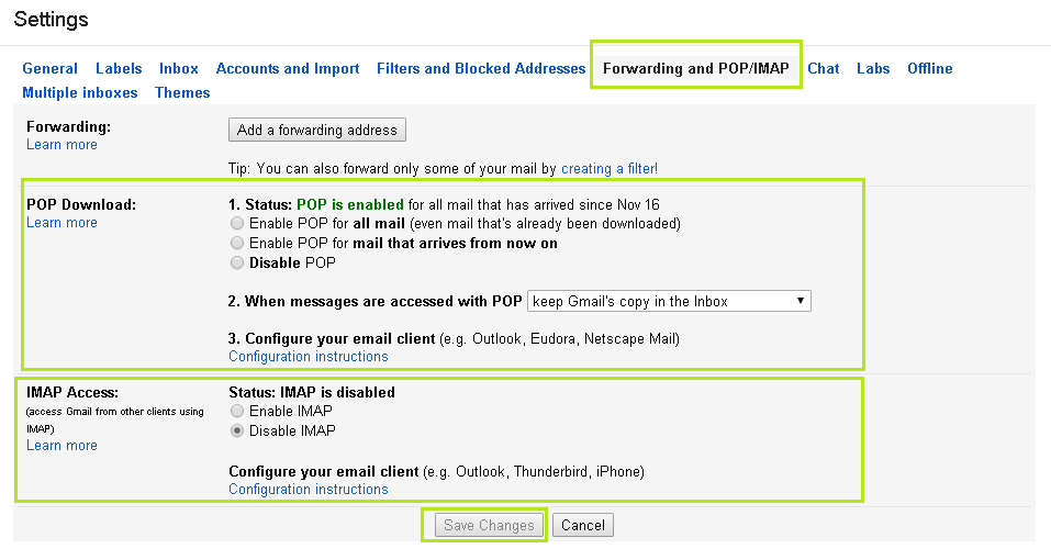 - Посетите страницу настроек пересылки и POP/IMAP.