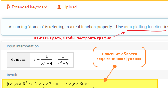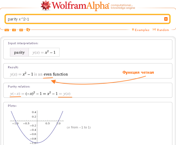 Для построения графиков функций и поверхностей в Wolfram Alphaможно использовать функцию «рlot», можно также добавить параметры построения, указав границы по оси Ох; даже если вы не укажете функцию «рlot»,система распознает и построит функцию, автоматически подобрав масштабирование.