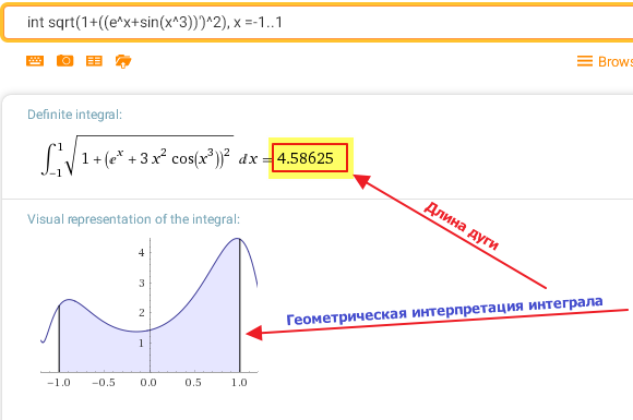 Программа поддерживает различные форматы для импорта и экспорта, включая электронные таблицы, двумерные и трехмерные графические форматы,мультимедиафайлы, документы, архивные файлы и т.п. Встроены функции для вывода графиков из точек, линий и поверхностей, гистограмм, двумерных и трехмерных диаграмм разного вида.В продвинутых версиях программы многими параметрами математической задачи можно управлять интерактивно, изменяя их с помощью кнопок«ползунков», либо с помощью калькулятора с окнами для ввода различных параметров, что представляет огромные возможности для математического исследования. Проиллюстрируем применение методов численного интегрирования для вычисления «неберущихся» интегралов. На рисунке 4 показано решение интеграла Гаусса в Wolfram Alpha.Рис.4 Вычисление «неберущегося» интеграла вWolfram Alpha